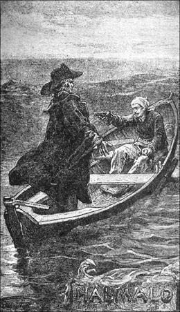 老头站在那里用压倒波涛的嗓音说着这些话的时候,波浪的起伏使他一时沉没在阴暗里,一时出现在阳光中。水手的脸色发青了;大滴的汗珠从他的前额上淌下来;他像树叶一样哆嗦着;他有时吻一下他的念珠;老头说完以后,他扔掉手枪,跪了下来。